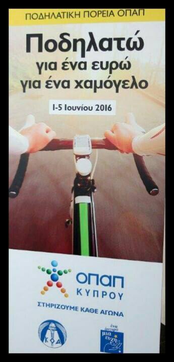 Σας ενημερώνουμε για την Παγκύπρια Ποδηλατική Πορεία της αθλήτριάς μας Μαρίνας Θεοδώρου, που θα πραγματοποιηθεί από την 1-5 Ιουνίου 2016. Η ποδηλατική πορεία γίνεται για δεύτερη συνεχή χρονιά υπό την αιγίδα του ΚΟΑ, σε συνεργασία με τον Παγκύπριο Σύνδεσμο «ΕΝΑ ΟΝΕΙΡΟ ΜΙΑ ΕΥΧΗ» και τη στήριξη της Κυπριακής Ομοσπονδίας Ποδηλασίας. Μέγας χορηγός η ΟΠΑΠ Κύπρου Λτδ.